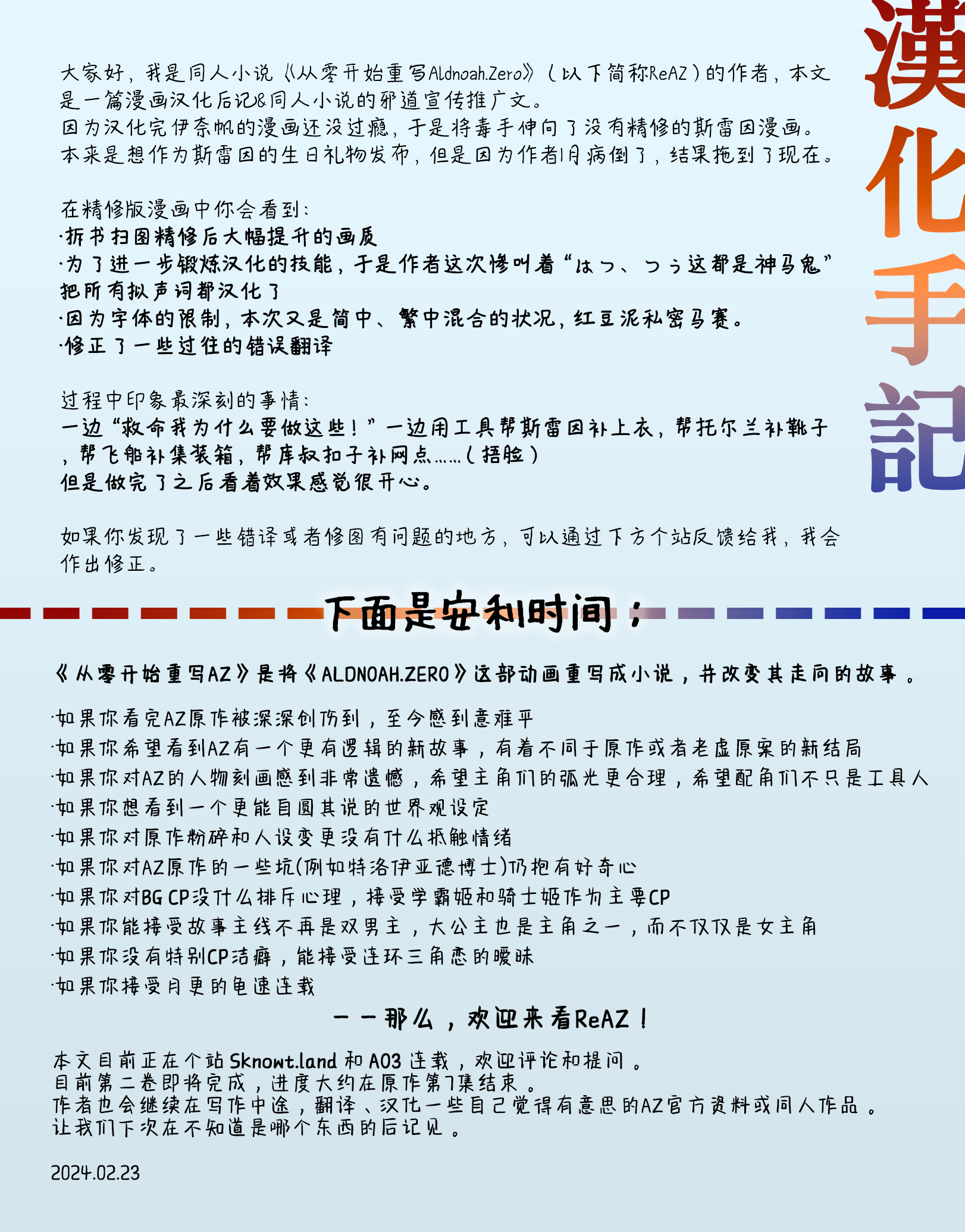 校对君您好!首先非常感谢您在漫画汉化过程中的参与和付出!以及抱歉直到今天才在闲逛的时候看见了您的回复,果咩。